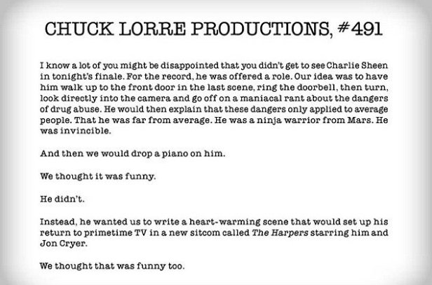 I’ll end this blog with a freeze frame of one of my favorite vanity cards, which always appear at the end of every Chuck Lorre production and often times act as personal messages to the audience (if they are fast enough to read them). This is the one that appeared after the series finale of Two and a Half Men, after Charlie Sheen was replaced by Ashton Kutcher years earlier.