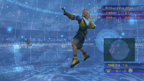 One other feature worth pointing out is the addition of a fictional sport called Blitzball. This is a strategy minigame that features prominently in FFX. It is an underwater sport with two opposing teams played in a hovering sphere of water in which you scored by passing and tackling as one character at a time. Tidus and Wakka are both players. Tidus is considered a star Blitzball player.