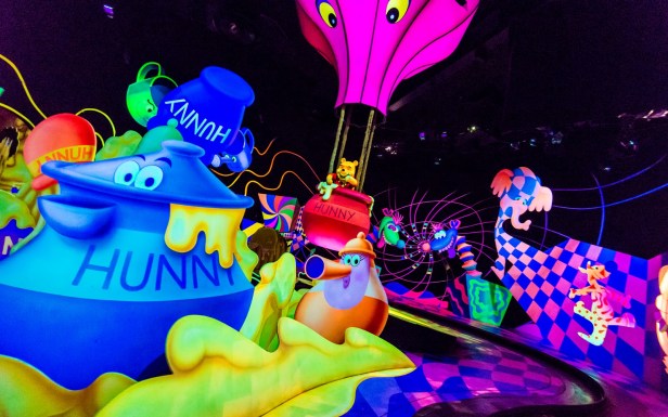 Those who sat in the beehive vehicles at the beginning of the ride were taken on a trek through the Hundred Acre Wood and if you’ve ever watched the 1968 Disney film Winnie the Pooh and the Blustery Day, you will recognize many of the scenes that unfold from there, Heffalumps, Woozles and all. Make sure all your honey is accounted for by the time the ride is over.