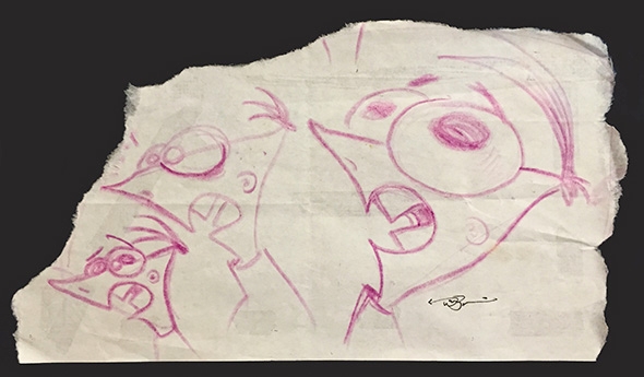 The character of Phineas was designed accidentally when Povenmire was doodling a triangle-shaped human in a restaurant one day and liked the drawing he made so much that he kept it. The geometrical art style was applied to every character in the show and it was influenced by Tex Avery’s cartoons from the fifties (which were in turn influenced by the animated films of UPA).