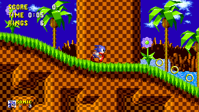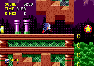 Sonic navigates six main zones in this game, each divided by two areas or “acts” (Act 1 and Act 2) before facing off with Eggman in a battle at the end of each zone.