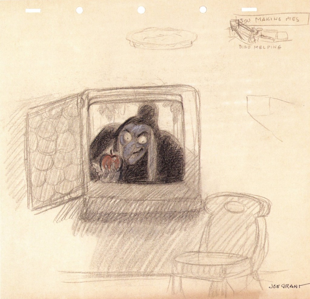 At Disney, Grant was a character designer as well as a story man (plot and dialogue developer), working on Silly Symphonies like Three Little Pigs (1933) and Who Killed Cock Robin? (1935) and the Disney feature Snow White and the Seven Dwarfs (1937) where he provided concept art and designed the Evil Queen in her hag form. Grant’s work on Snow White inspired Walt to create the character model department which Grant headed until the late 1940s.