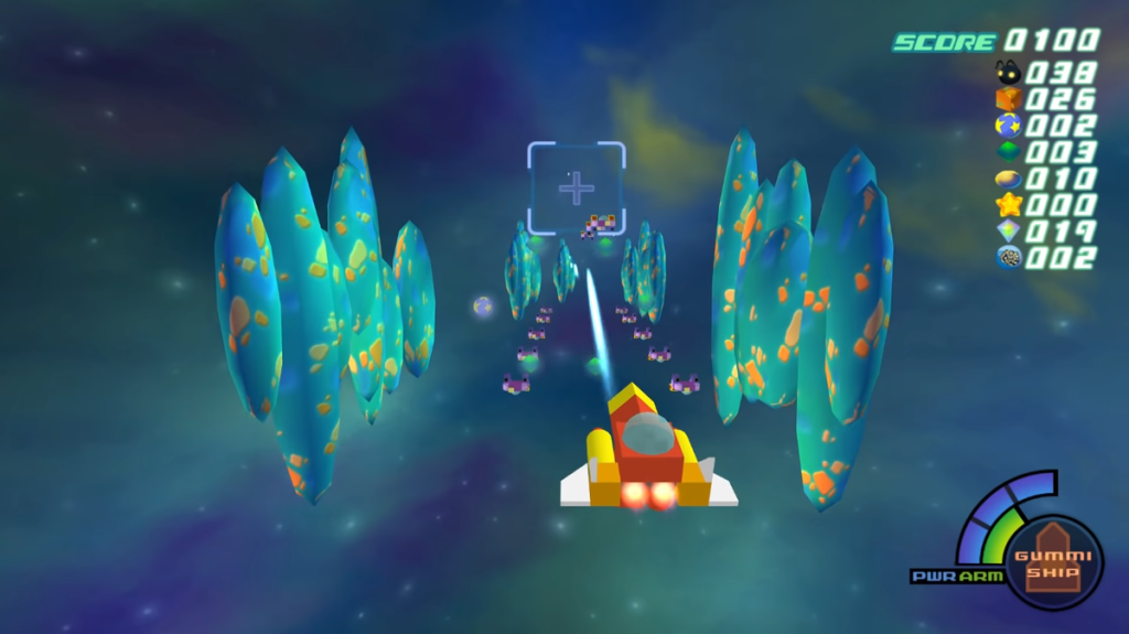 Meanwhile at Disney Castle, Donald Duck the court wizard and Captain Goofy of the royal guard realize King Mickey Mouse has disappeared and has left Donald and Goofy instructions to find the “key.” In his letter, Mickey says the stars in the sky are blinking out and he has to investigate because he senses disaster, and that Donald and Goofy must go to Traverse Town and find someone with a key. With their orders, Donald and Goofy set out in their Gummi Ship, a special ship that allows for space travel between worlds, and fly to Traverse Town. The Gummi Ship in this game is made of Gummi blocks, and you can add, paint and rearrange blocks (with help from the ship’s mechanics Chip and Dale) so that you can customize it to your liking. Plus the Gummi Ship has fire power so as you fly between worlds, you will often have to fight off cosmic enemies in a Star Fox-like rail-shooter section of the game.