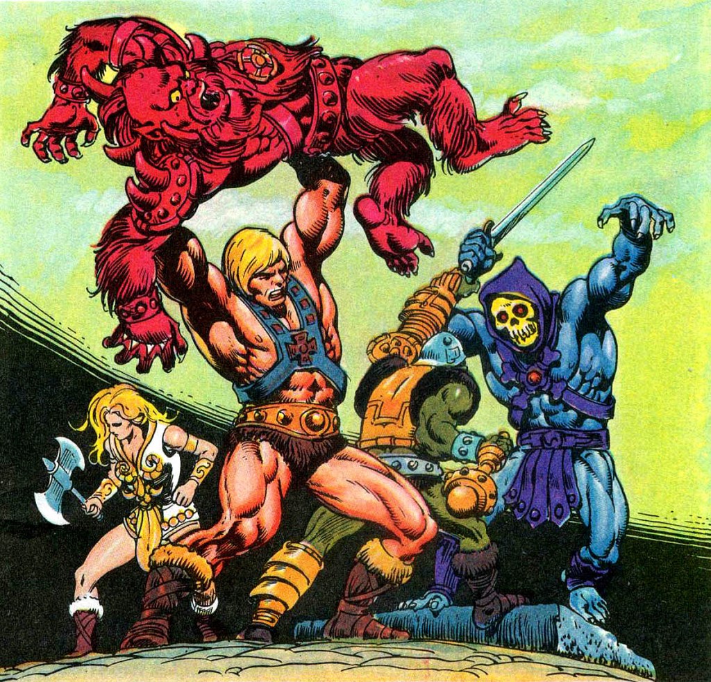 The character became known as He-Man, the most powerful man in the universe. As the franchise evolved, He-Man’s backstory and the mythos of Eternia began taking shape. The most famous version: Prince Adam, prince of Planet Eternia who resides in Castle Grayskull, transforms into He-Man when wielding his Power Sword and uttering the words “By the power of Grayskull…” In the process, the prince’s pet, a timid green tiger named Cringer, would also transform into the mighty Battle Cat who wears armor and who He-Man often rides into battle. He-Man’s main archenemy is the sorcerer Skeletor, evil lord of destruction who hails from another dimension and seeks to conquer Castle Grayskull. The series is a combination of medieval sword and sorcery and science fiction, and the backstory was explained within the pages of minicomics that accompanied the release of the toys. DC Comics was responsible for these early comics and publishers like DC, Marvel, Dark Horse and Image would continue making Masters of the Universe comics for years afterward.
