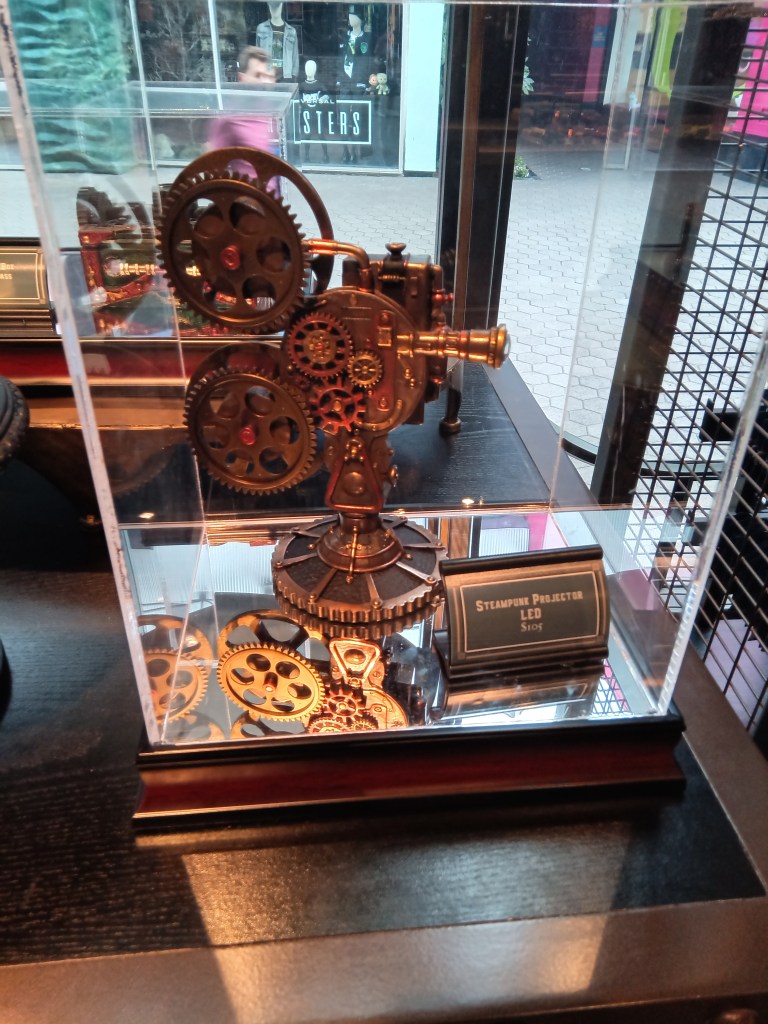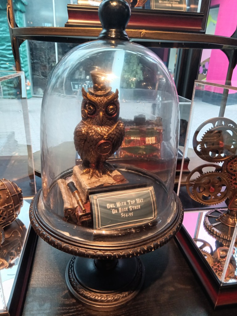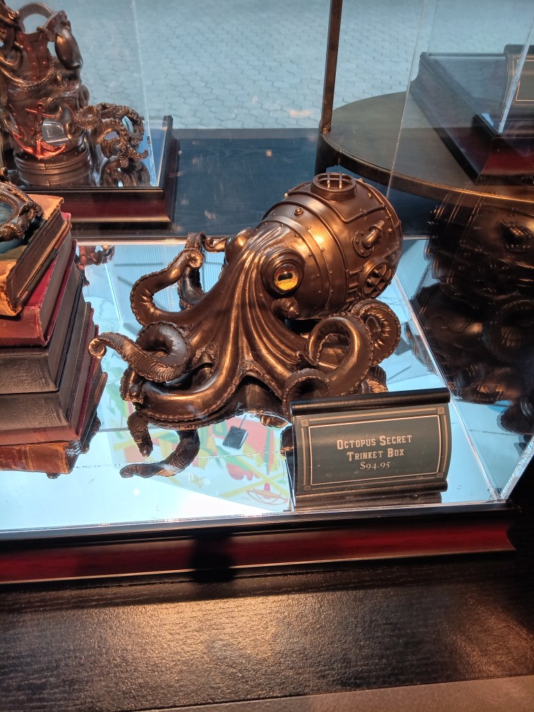 The plaza was amazing, featuring a lot of places that sell clothes, toys, books, hats, sunglasses, etc. Plus there were a lot of places to eat and drink like Taco Bell, Jamba Juice and the diner Johnny Rocket’s (the Peanut Butter Shake I got there is one of the best things I ever tasted), but the first place we went was the Toothsome Chocolate Emporium. We weren’t sure what type of place this was, but when we walked inside we realized it was basically a restaurant combined with a gift shop, with not just a chocolate theme but a steampunk theme. This was by far one of the biggest highlights of our trip just for the aesthetic alone.