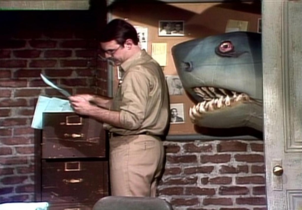 ▪️Host and star of Jaws Richard Dreyfuss gets attacked by Landshark. John Williams’ Jaws theme can also be heard.