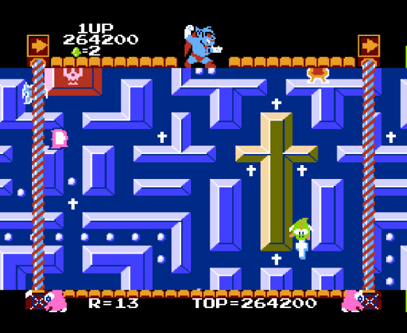 Shigeru Miyamoto would direct his first console-exclusive game when he teamed up with designer Takashi Tezuka on the Famicom game Devil World (1984), a Pac-Man-style game in which you control a dragon named Tamagon who must navigate a monster-filled maze while touching the crosses to gain power. At the same time, the winged Devil at the top of the screen makes things extra challenging by manipulating the borders of the wall surrounding the maze, which may result in you getting squished between walls and losing a life if you aren’t careful. This game is little known to American gamers because it was a Japan exclusive, due to what would be seen by too many American families as a blasphemous use of religious symbols, but most critics and gamers called it fun and inventive if perhaps too complex. Importantly, it would also mark the first time Shigeru Miyamoto teamed up to create a game with Takashi Tezuka, who would later become one of Miyamoto’s most successful collaborators.