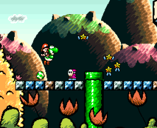 The object of the platforming game was for Yoshi to reunite Baby Mario with his brother Baby Luigi by travelling across the island until you reach Baby Bowser’s lair while defeating his cronies along the way, often by using your tongue to eat them just like in Super Mario World and then either spitting them out or swallowing them and turning them into eggs which could then be aimed and hurled, sometimes to defeat certain foes and sometimes to solve certain puzzles. The game was designed to be more easy for beginners than Super Mario World was, reflected not only by its crayon drawing art style but also by the flutter jump, a great addition which lets Yoshi hover in mid-air for a moment before falling and has since become one of Yoshi’s signature moves. You also had the ability to ground pound, shoot watermelon seeds like a machine gun and spit flames after eating fiery foes. One of the most fun new additions however was Yoshi’s transformation into a variety of vehicles like helicopters, submarines and a drilling machine that helped him dig underground.